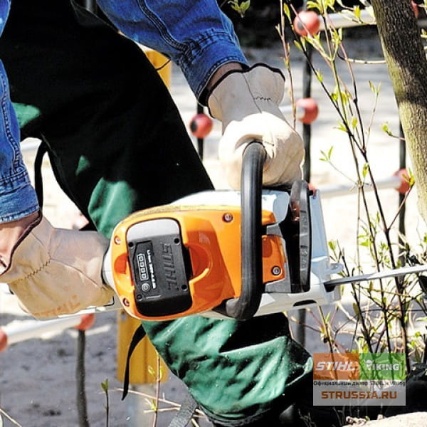 Дополнительная система торможения STIHL для дополнительной безопасности: пильная цепь за секунду останавливается не только при достаточно сильной отдаче или при активном нажатии на передний упор для рук, но и при отпускании задней рукоятки. Эта уникальная функция безопасности обеспечивает ещё более высокий уровень защиты в любом рабочем положении.